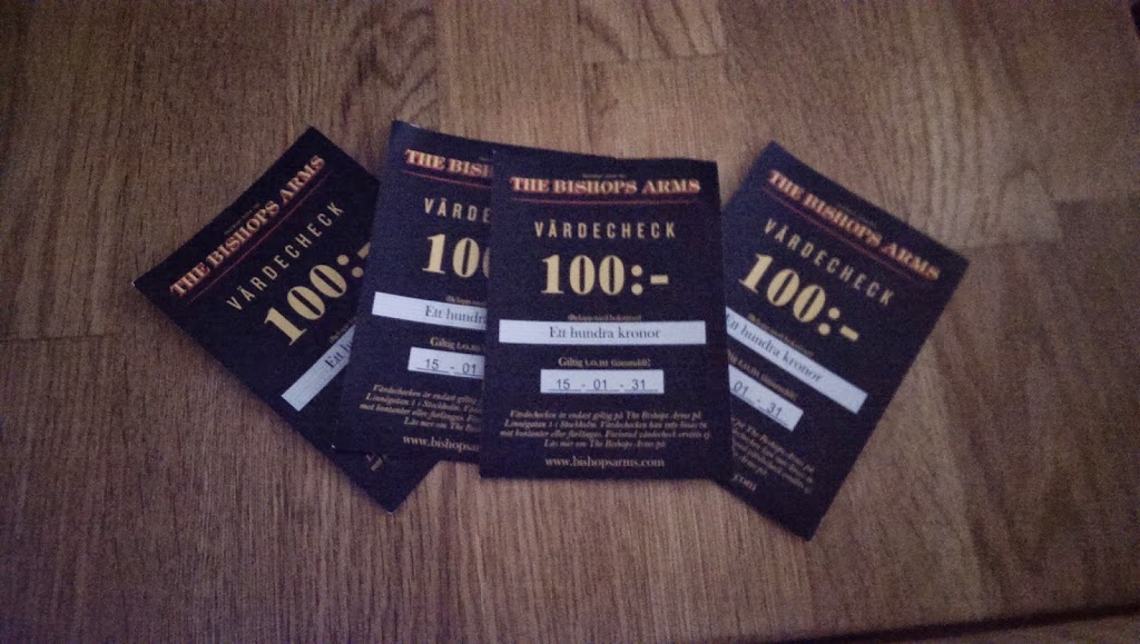 Per kom hem med fyra värdecheckar a´100 kronor, så nu blir det lite snacks och någon öl på Bishop Arms på stan. De gäller bara på Bishop på Linnegatan , så det blir väl att styra kosan dit. De går ut i morgon så det gäller väl att passa på….