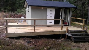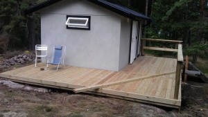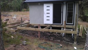 Har gjutit fyra plintar igår, allt tar mycket längre tid än man tänkt sig. Alla bräder ligger nere på bryggan oxå, så när man behöver en så är det ”bara” att hämta… Blir ett litet motionspass bara det varje gång. Men ena sidan av altanen är nästan färdiggjuten och har fått härda inatt, ska pallra upp kortsidan och gjuta den idag och sätta fler reglar mellan ramarna.