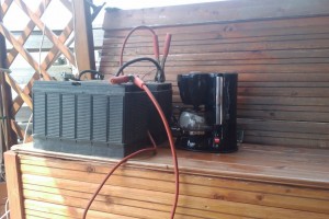 På vår morgonpromenad härom morgonen fick vi kaffe på bryggan borta hos Micke och Johan. De hade en 12V kaffebryggare kopplade till två bilbatterier… Vad gör man inte för lite kaffe…?