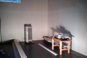 Klockan är strax efter 23 och har precis kommit fram till Västervik. Var väldigt tungt lastade kan man säga med bl a 200 kilo golv i bilen. Det är svinkallt härinne, 11 grader… och sängkläderna lär ju vara lika mysigt kalla… Ja, ja ska inte sova än. Måste slipa skarvarna på väggarna som vi spacklade sist och stryka på ett lager klister på väggarna innan vi kan lägga oss. Väggarna var tvungna att mättas med klister innan man sätter upp väven, annars kan den ramla ned, och det ska torka 12 timmar innan.
