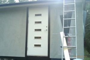 Fick in ett av fönstren och dörren i söndags innan vi åkte, dock hann vi inte sätta dit fönsterbleck och ett bleck under dörren och över ska det oxå sitta ett dörrfoder.