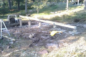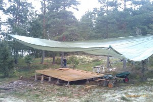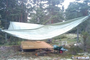 Har regnat hela dagen så vi har inte kunnat bygga något. Men nu har vi varit inne i Västervik och köpt en presenning på 7.5x12m och hyrt en bygglampa. Så nu kan varken regn eller mörker stoppa oss. Nu, dags att bygga…