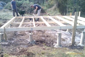 Har lyckats få upp yttertakstolarna hittills idag. De vägde ca 80 kilo st och skulle upp drygt två meter. Vi byggde en slags hissanordning och hissade upp dem, annars hade det aldrig gått. Har lagt ca en tredjedel av golvet oxå.