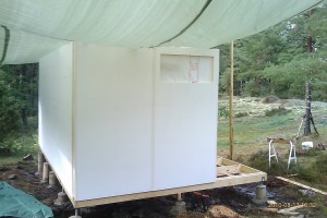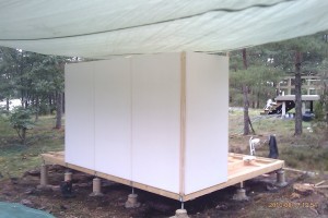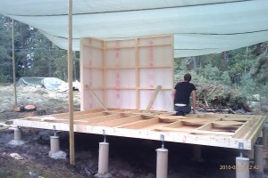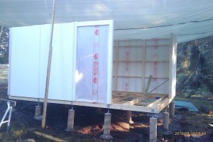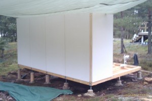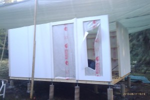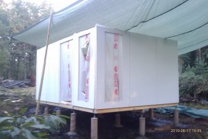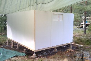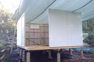 Efter att ha fått jobba utan regn på eftermiddagen har det rullat på. Alla väggsektioner är nu uppe. Ska börja isolera golvet och lägga golvplankor nu i skenet av bygglampan, är kolsvart ute nu.