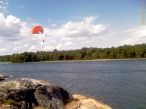 Kom till Västervik vid 22-tiden igår. Micke och Johan tittade förbi och drack en öl nere på bryggan i den varma kvällen. I dag har jag badat och Johan har flugit fallskärm efter båten. Han startade från klipporna i viken vid vårt hus och det sista han sa innan han lyfte var ” Nu dör jag”. Det såg jäkligt otäckt ut faktiskt. När båten fick fart skjöt han upp i luten som en raket och åkte ett varv runt ön ca 40 meter upp i luften. På bilden är han på väg ned för landning. Han hade en skaplig adrenalinkick när han kom ned. Thomas och Beatriz kom i eftermiddags, så nu är vi fullt hus. Det blir inget takläggande nästa vecka för det ska bli regn, så det blir väl senare…