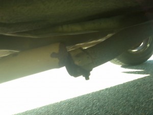 Murphys lag har drabbat oss igen…. Vi kom bara till strax utanför Norrköping igår innan hela avgassystemet gick av på mitten… Fast denna gång lät inte bilen som en tvåtaktsmotor, utan som ett reaplan. Hade som tur var lite avgastätningstejp kvar sedan våra tidigare lagningar som vi försökte sätta ihop delarna med och lindade om med en sladd med koppartråd som vi skalade av plasten på… Detta på E4 såklart!!! Vi tog oss in till Norrköping med denna lagning i alla fall och till en ”Gör-det-själv mack” där man kan hissa uppp bilen och Pers morbror kom med verktygslåda så vi kunde sätta dit ett provisoriskt rör med ringklämmor. Vi tog oss tillbaka till Linköping och ska byta ut hela avgassystemet idag innan vi åker till Stockholm ikväll. Micke har lovat att hjälpa oss igen… Vad skulle vi göra utan honom? Han är en klippa!!!!
