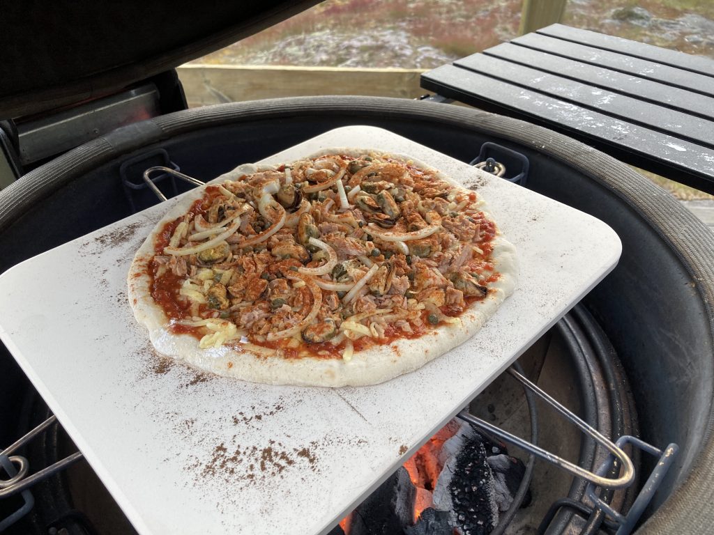 pizza med tonfisk, musslor, lök och kapris och cayennepeppar.