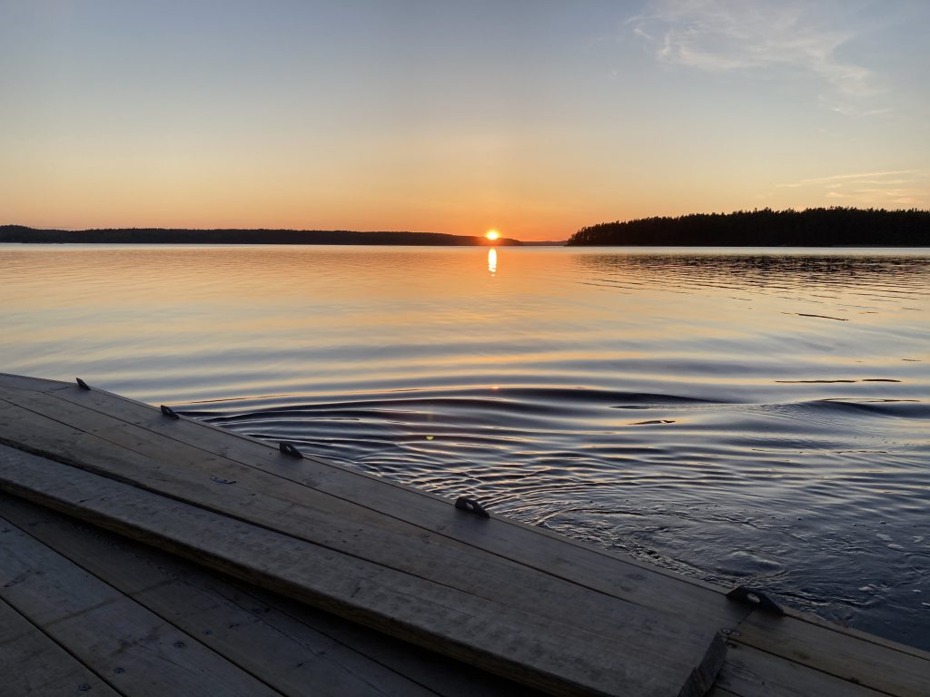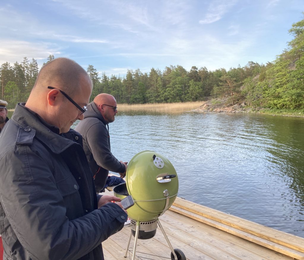 Senare på kvällen undrade Micke och några andra om vi skulle följa med på grillkväll på ”flotten” så vi var ute en sväng och grillade i solnedgången. Vackert och trevligt! Gjorde egna hamburgare och grillade.