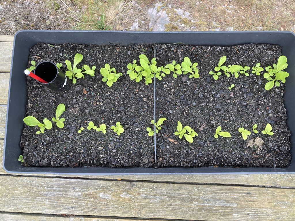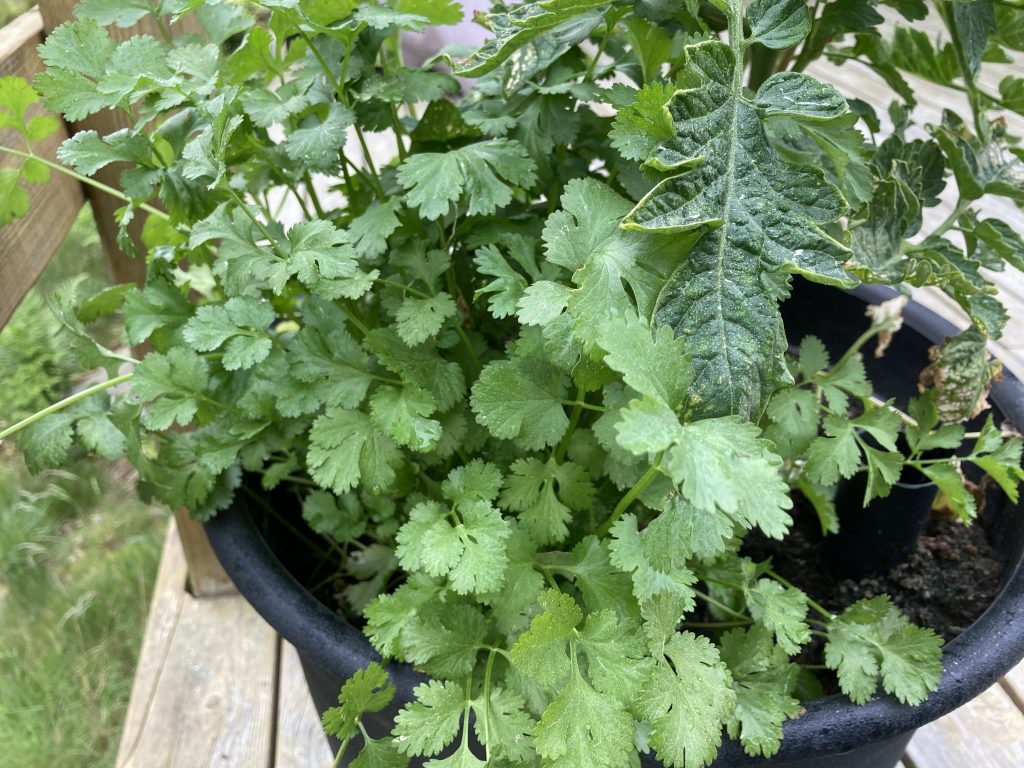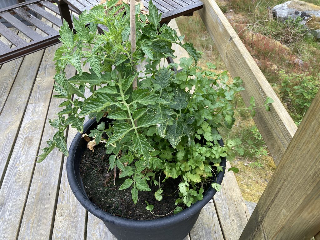 Salladen och rädisorna har börjat komma upp lite oxå, även om de är ganska sena i år. Förmodligen för att det har var så kallt. Någon som däremot trivts är koriandern. Köpte en kruka på en vanlig affär och planterade ut. Har gjort det tidigare, men då har den dött, eller knappt vuxit alls. I år är den däremot större än tomaterna…
