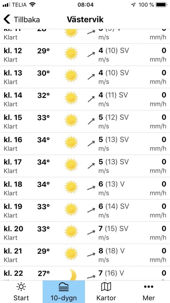 I dag ska det bli ännu varmare, 34 grader på eftermiddagen. Blir att åka hem sent ikväll så man kan utnyttja dagen till att bada. Är redan 22 grader i havet.