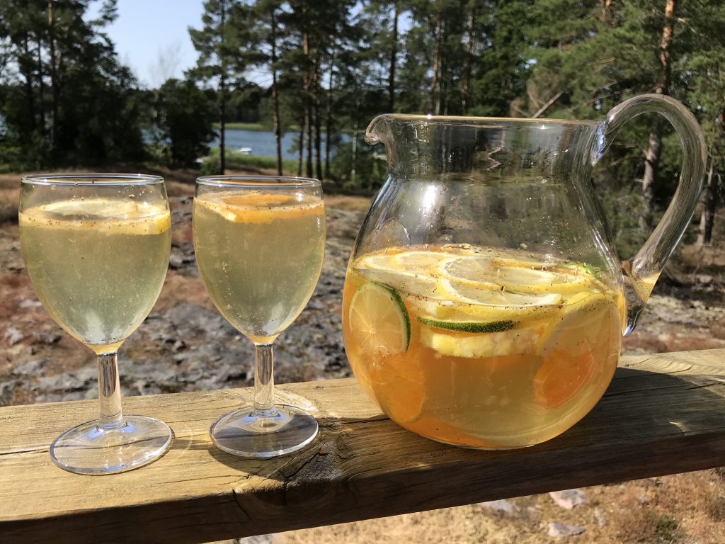Gjorde även sangria när på vitt vin, lime, citron och apelsin. Sedan lite konc. fläderblomsaaft och sprite. Jättegott!!!!