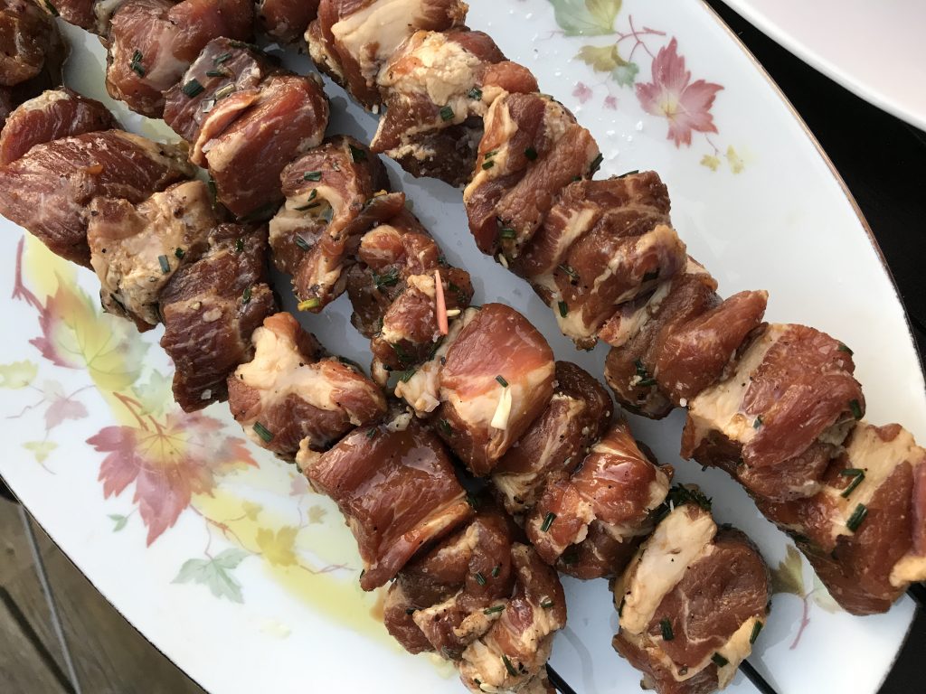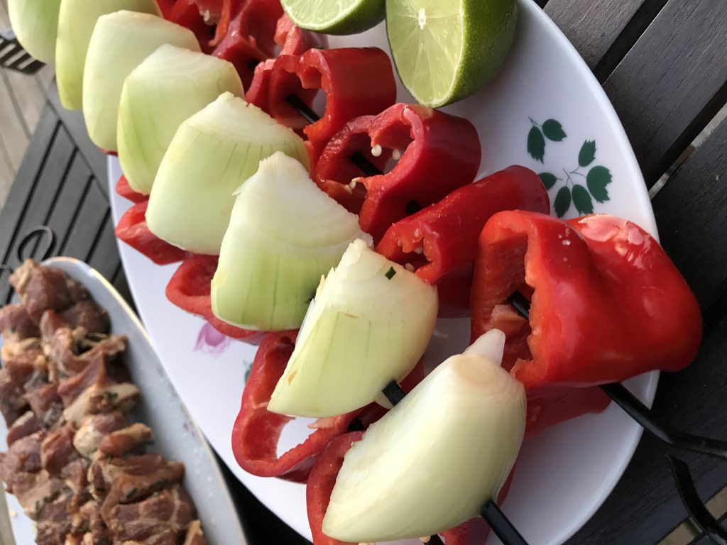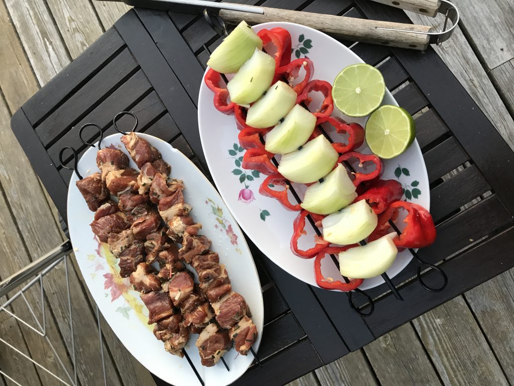 Grillade kött och grönsaksspett och åt inte förrän kl 23, man var inte hungrig i värmen. Kunde dessutom sitta ute och äta…