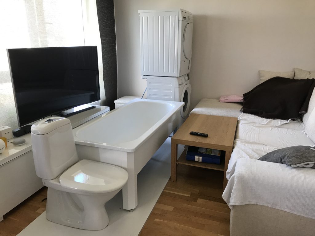 Nu har de röjt ut badrummet under dagen… Och ställt inte bara tvättmaskin och torktumlare i vardagsrummet, utan även badkar och toalett… Lite trångt kan man säga 🙁