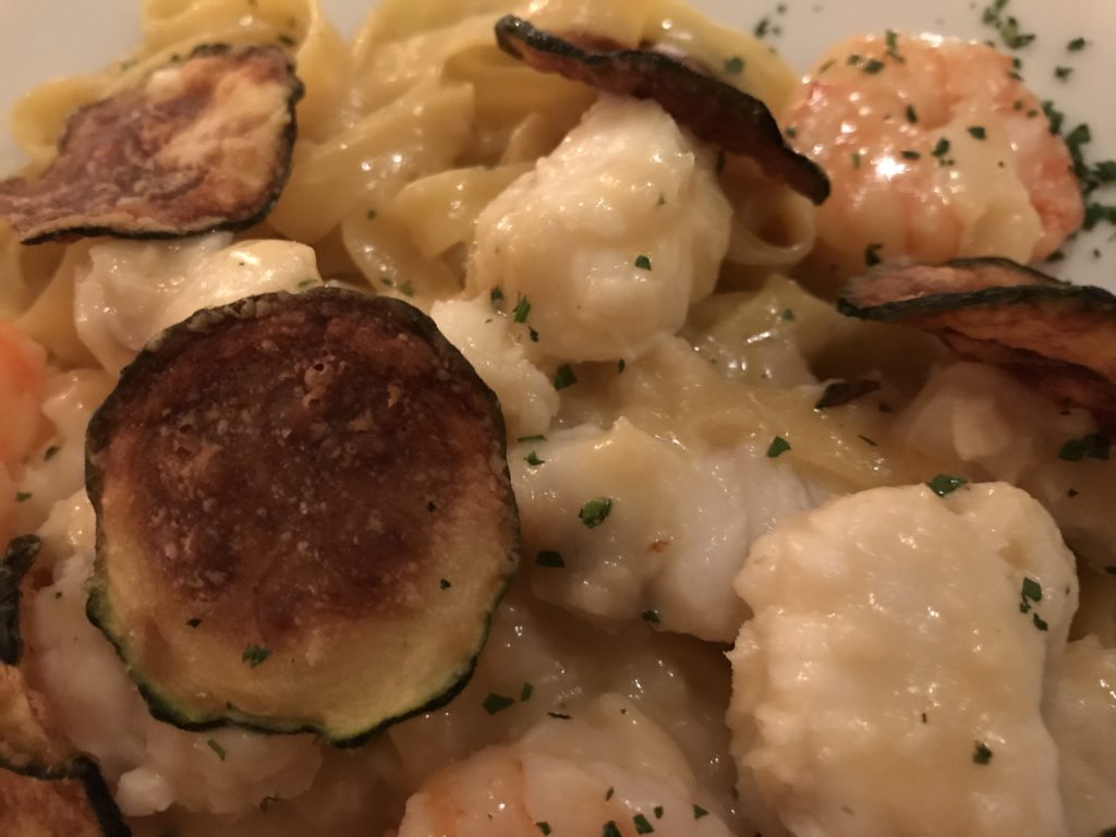 Gick sedan och åt pasta igen, med jätteräkor och marulk med friterad aubergine ovanpå som var väldigt god.