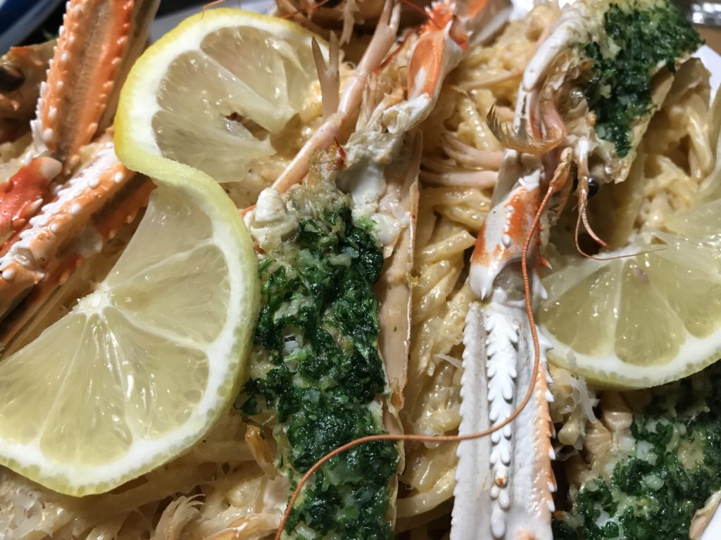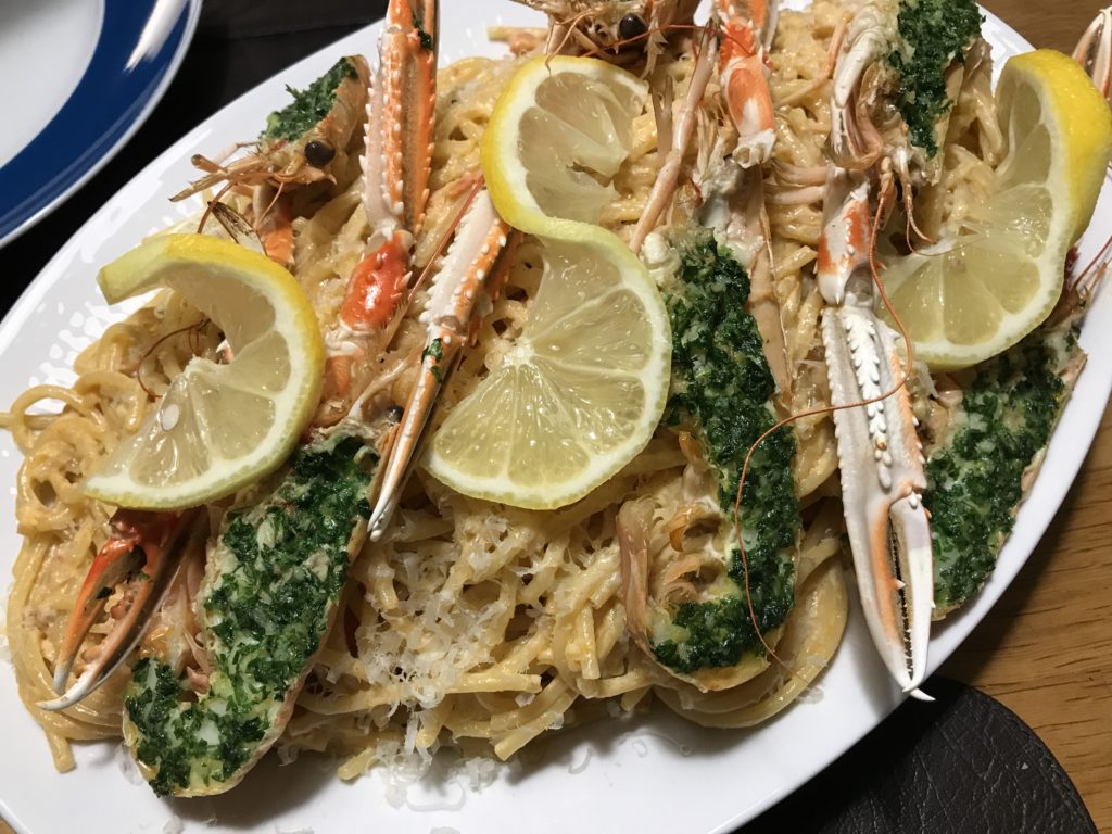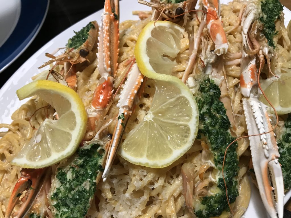I går kväll gjorde vi pasta med havskräftor- stod att den var ”to die for”- det vet jag inte men den var absolut god. Ganska mycket styr kan jag tycka för man skulle koka egen fond av skalen och några kräftor skulle gratineras….
