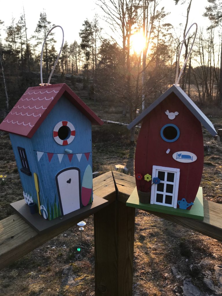 Har köpt några fågelholkar som vi ska sätta upp till fåglarna. Trevligt med lite färg eftersom de flesta fågelholkar bara är grå och trista. Ska åka in till Västervik en sväng senare idag och köpa jord och lite frön så att vi kan börja plantera lite.