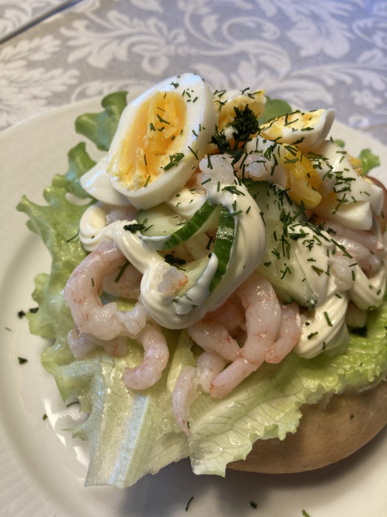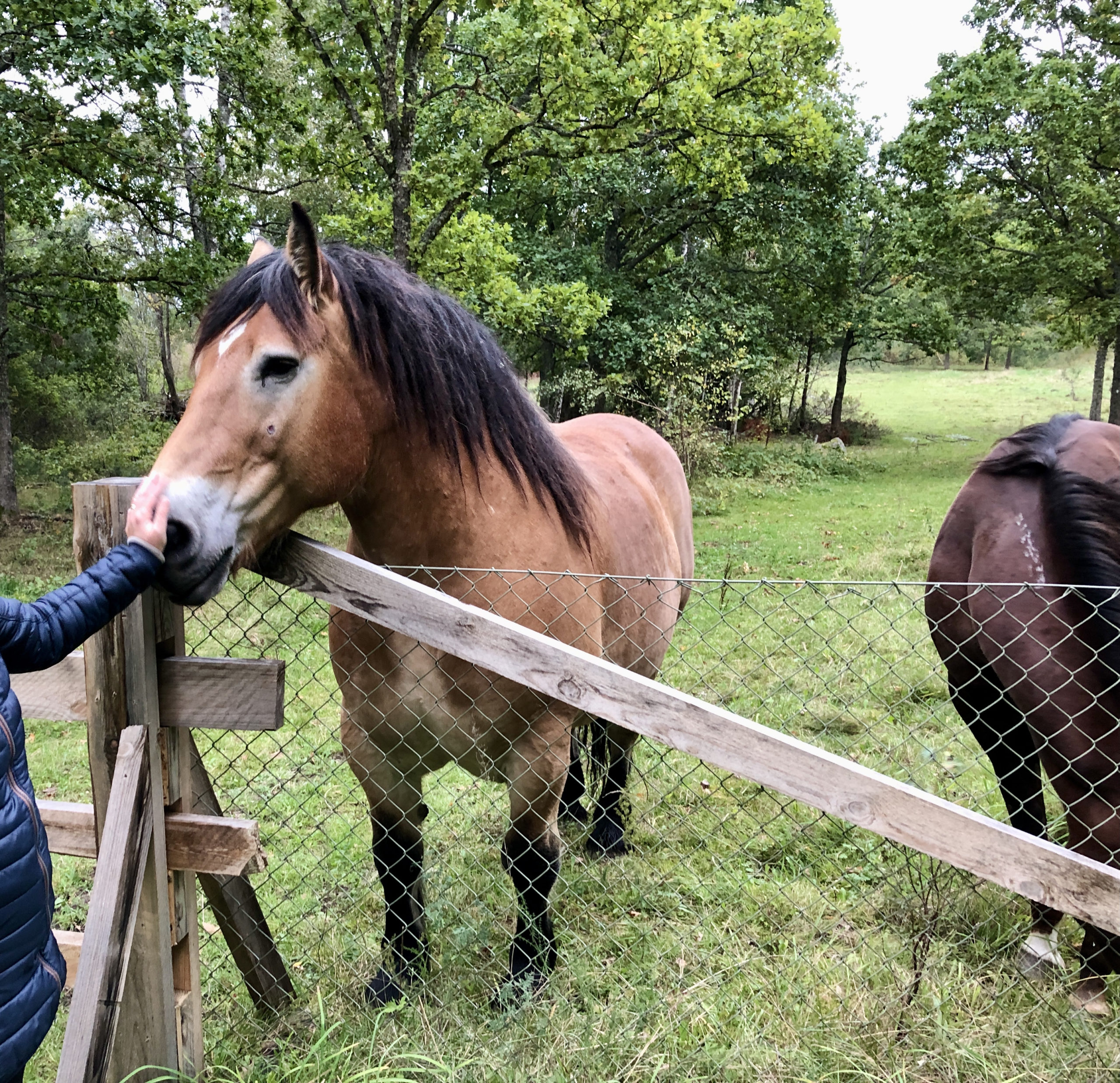 Blev ialla fall räkmacka när jag kom och sedan en lite promenad för att plocka lite svamp och hälsa på hästarna. 🙂 De brukar alltid ha hästar i hagen här på sommaren, men de brukar aldrig vara kvar så här länge. Syns inte så bra på bilden, men den vänstra hästen är en jättestor Ardenner som väger 1200 kg, då hade han även bantat 100kg och så hans ögonsten, en liten travare 🙂