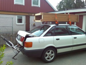 Har varit inne i Västervik hela dagen och åkt runt och hyrt bergsborr, köpt massa brädor, 500 kilo betong och så kommer det en leverans på fredag med 380 löpmeter lärkträ. Vi ska bygga en 7 meter lång altan, så det kommer att bli som en dansbana här. Kommer att ha träningsvärk i morgon i armarna efter att ha lastat allt först på släp och sedan ned i båten. Allt blir säkert bra när det blir klart. Bara det inte tar sex år som taket innan det är klart… 🙂