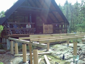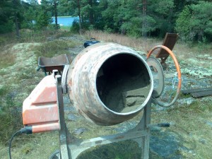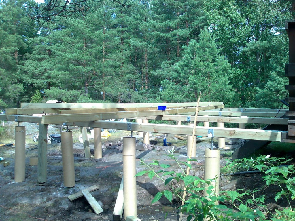 Det gick hundra gånger snabbare att blanda betong i en riktig blandare i stället för att blanda för hand. Började ösregna och åska på eftermiddagen igår och fortsatte hela kvällen. Ganska mysigt iof men inte så kul att vara ute och jobba i regnet. Vi kortade av altanen en meter, insåg att den blev lite för stor. Idag; fortsatt byggande…